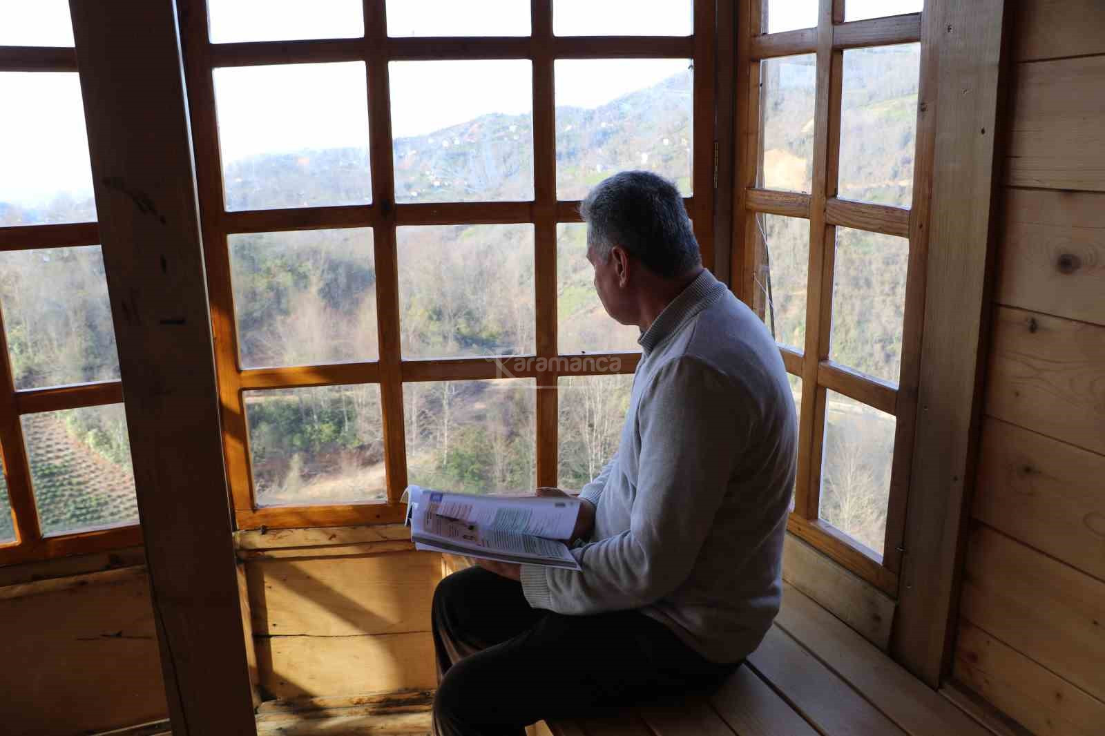 Tamamen ahşaptan yapılan evi hiçbir ustanın yardımı olmadan kendi emekleriyle yaptığına vurgu yapan Ali Hamdi Uzunhasanoğlu, "Emekli olduktan sonra hobi olarak arıcılık ve inşaat işleriyle uğraşıyorum. İnşaat işlerini çok seviyorum ve bu işlere hala devam etmekteyim. Bana diyorlar ki sen inşaat sektöründe doktorsun. Ben inşaat doktoruyum. Ben bir gün buraya geldim. Böyle durdum burada. Dedim burada her tarafı görmek şartıyla bir kamelya düşündüm. Her tarafı cam olacaktı be burada kar yağarken ben uzandığım yerden manzarayı seyretmeyi düşündüm.