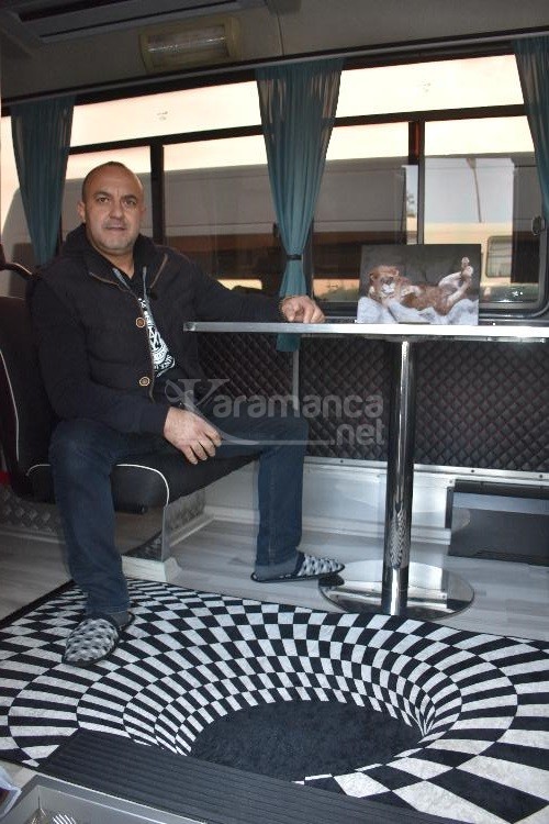 İçinde katlanır yatak, erzak dolabı, ocak, televizyon, uzaktan kumandalı led aydınlatma, buzdolabı, tuvalet, güneş panelleri, hidrofor duş, müzik sistemi ve diğer aksesuarlarla donattım. Minibüsümü ilçede çekilen dizilerde ve filmlerde oynatmak için kiralamak istiyorlar ama ben kabul etmiyorum. Gören hayran oluyor. Önünde ve içinde fotoğraf çektiren çok" dedi.
