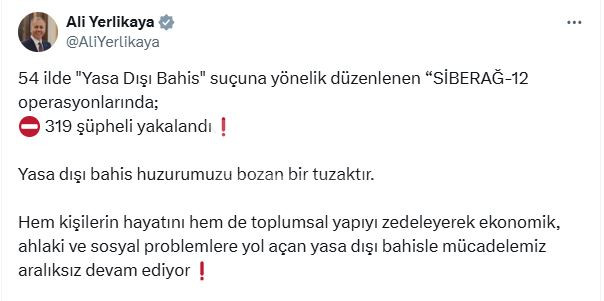 İÇİŞLERİ Bakanı Ali Yerlikaya, 'Yasa dışı bahis' suçuna yönelik 54 ilde düzenlenen 'Siberağ-12' operasyonlarında, 319 şüphelinin yakalandığını açıkladı.