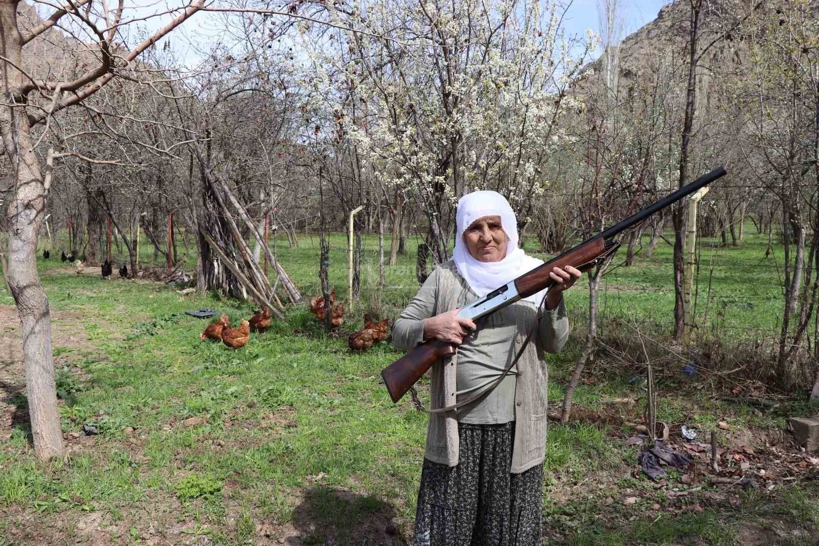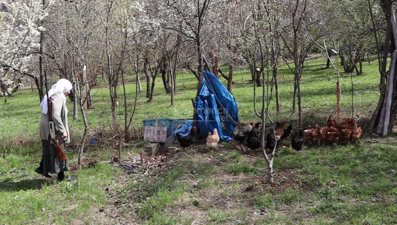 Bahçelerde tüfek omuzunda gezen Gülistan teyze, arada sırada tüfekle havaya ateş ederek çakalların tavuklara yaklaşmasını önlüyor.