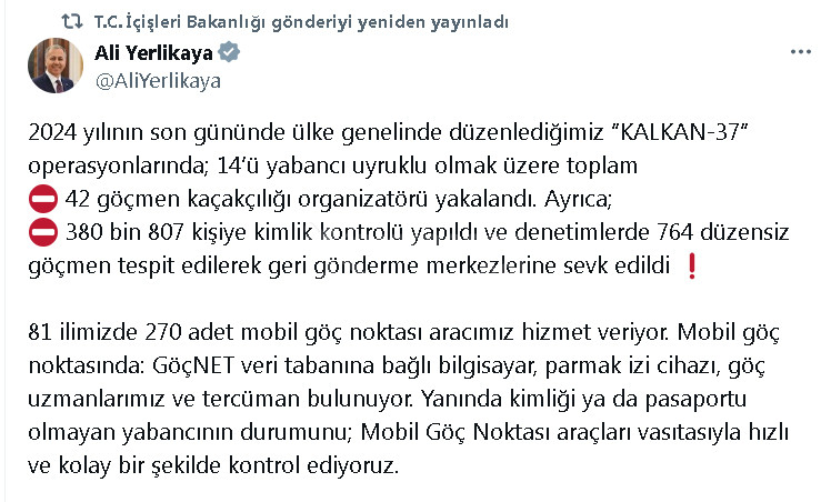 Bakan Yerlikaya, sosyal medya hesabından yaptığı açıklamada, Cumhuriyet başsavcılıkları ile Göç İdaresi Başkanlığı koordinasyonunda 2024 yılının son gününde ülke genelinde 'Kalkan-37' operasyonları düzenlendiğini belirtti.