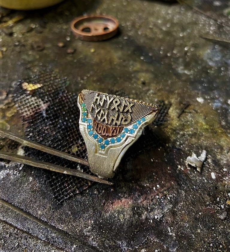 Bu yıl da tabii muhteşem yüzyılımız var. Cumhuriyet'in 100. yılı. Devlet beye yapmasak olmazdı. 100. yıla özel güzel bir yüzük yaptık. 'Turan' ismini taşıyor. Gerçekten kendisi de çok beğendi. Sonrasında rozetini de yaptık biz bunun. Bizi de davet etti sağolsun. Oraya gittik, kendisine yüzüğünü teslim ettik, kahvesini içtik. Yüzük tamamen Türklüğü anlatan, Türkiye Cumhuriyeti'ni anlatan güzel bir tasarım oldu. Üstünde bozkurt, bozkurtu çevreleyen hilal, hilalin içerisinde Türkiye Cumhuriyeti yazısı. Kenarında Göktürk alfabesiyle Türk, diğer tarafında ise Göktürk alfabesi ile Devlet Bahçeli yazıyor.