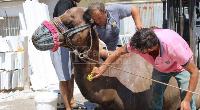 Hava sıcaklığının 44 dereceye ulaştığı Aydın'da nem ile birlikte gölgede 40 derece hissedilen hava sıcaklıklarına karşı deve yetiştiricileri yıkama ve yağlama işlemine erken başladı. Bu yıl haziran ayının girmesi ile birlikte aşırı sıcaklardan dolayı develerin keyfinin kaçtığını belirten devecilerden Erdinç Akçay, küresel iklim krizinden develerin de olumsuz etkilendiğini söyledi.