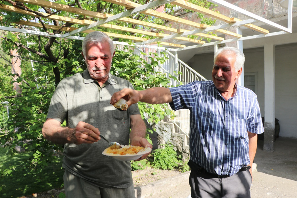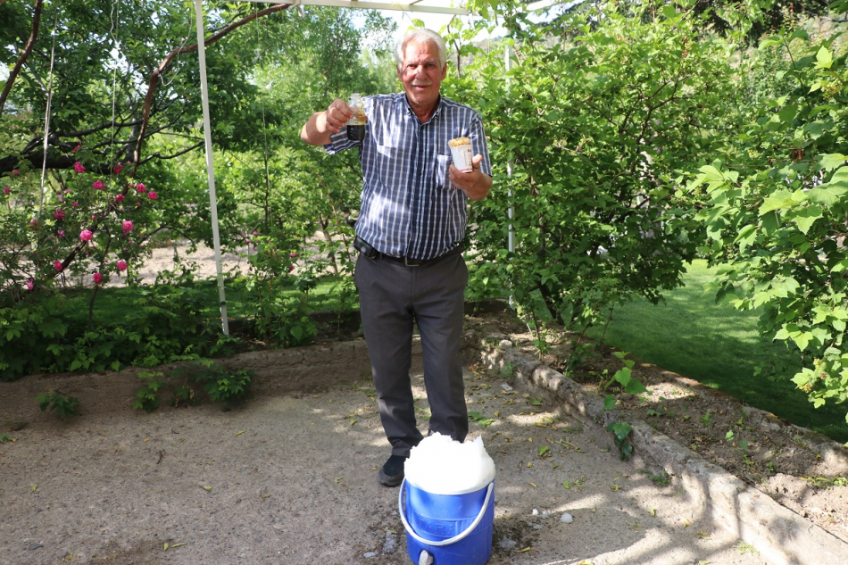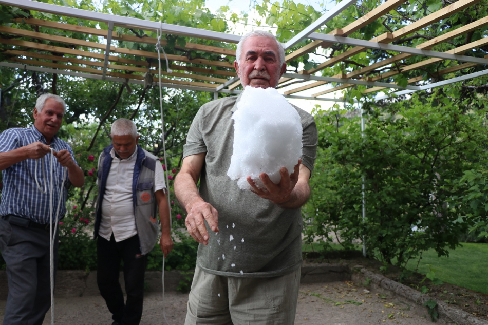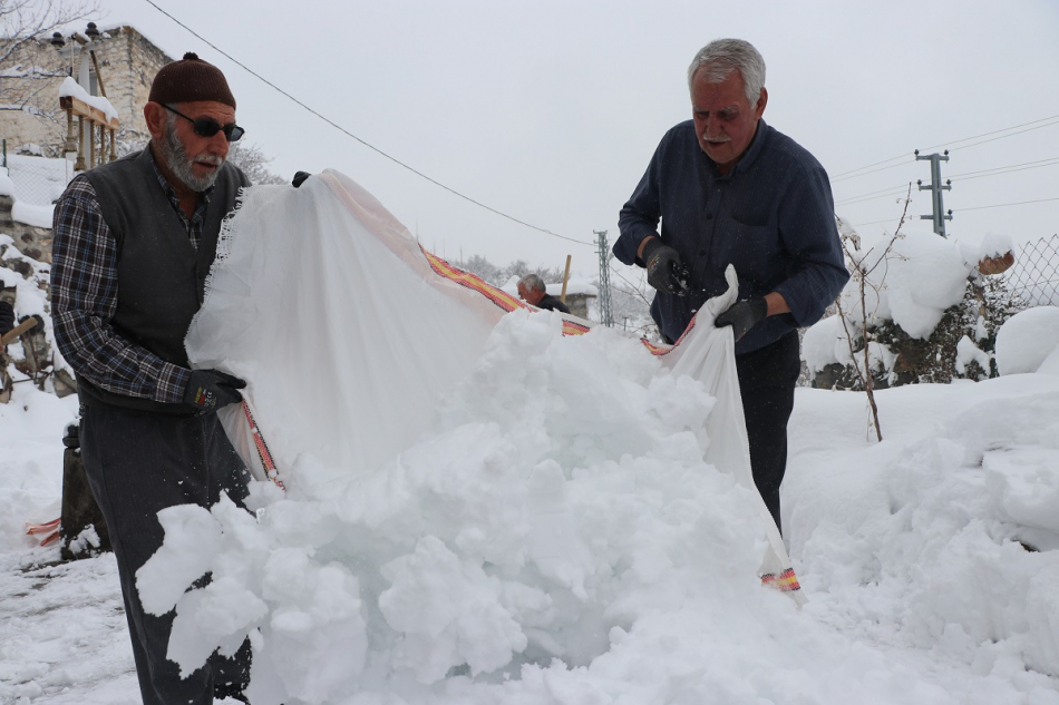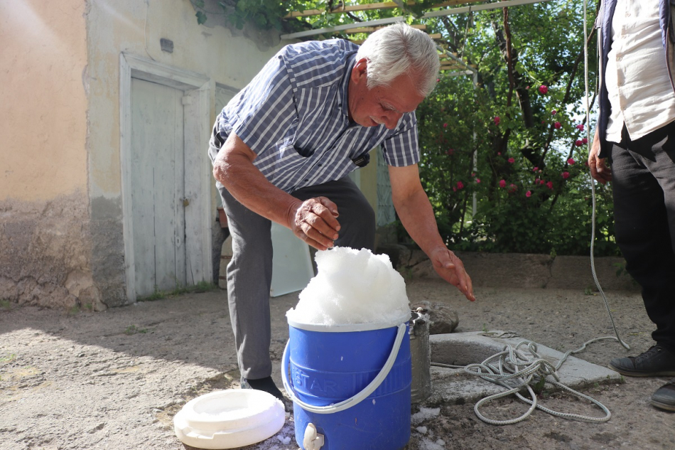 Ama günümüzde şebeke suyu geldiği için bu karı nostaljik bir şekilde dolduruyoruz. Yaz günlerinde terlediğimiz zaman, sıcak günlerde, bahçe işleri ile uğraşırken, dışarıdan gelen insanlara burada yardımcı oluyoruz, kar veriyoruz. Ayranı bu karlı suyla yaparız, içeriz. Pekmezimizi de kara dökeriz, kaşık kaşık yeriz. Bu geleneği yaşatmak için arkamızdan gelen arkadaşlarımız var ama bu işin sonuna doğru geliyoruz" diye konuştu.