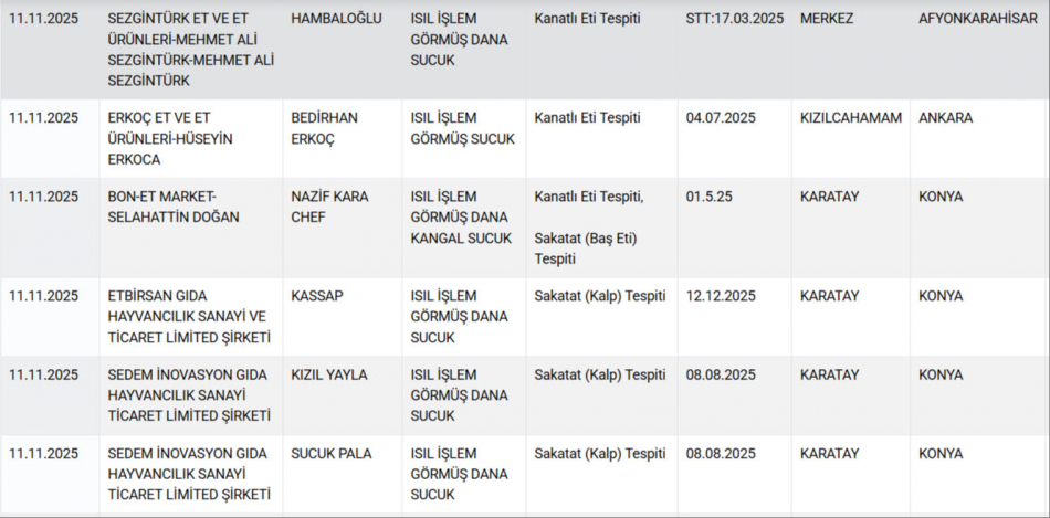 Listenin en çarpıcı ve mide bulandıran bulgusu, bazı işletmelerin vatandaşa sucuk diye at ve eşek eti yedirdiğinin ortaya çıkması oldu. Sadece büyükşehirlerde değil, Anadolu'nun farklı illerinde de tespit edilen tağşiş, gıda güvenliğinde hâlâ kat edilmesi gereken mesafenin büyüklüğünü gösteriyor.