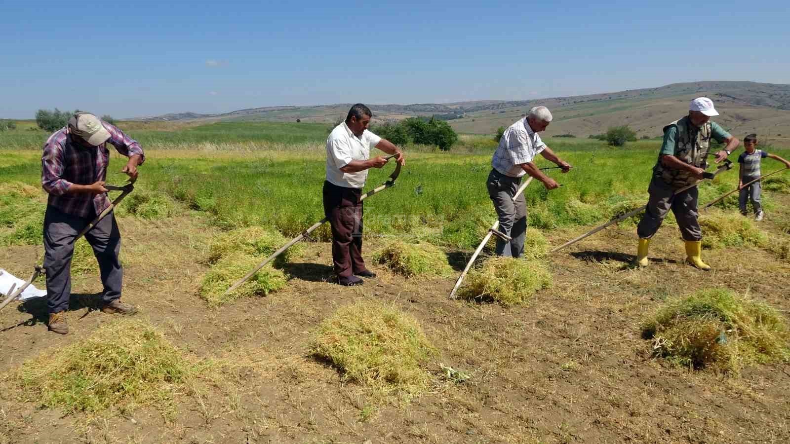 Yozgat'ta günlüğü 800 ila 1000 lira arasında değişen ancak her geçen gün sayıları azalan tırpan işçilerinin yeşil mercimek hasadı mesaisi başladı.