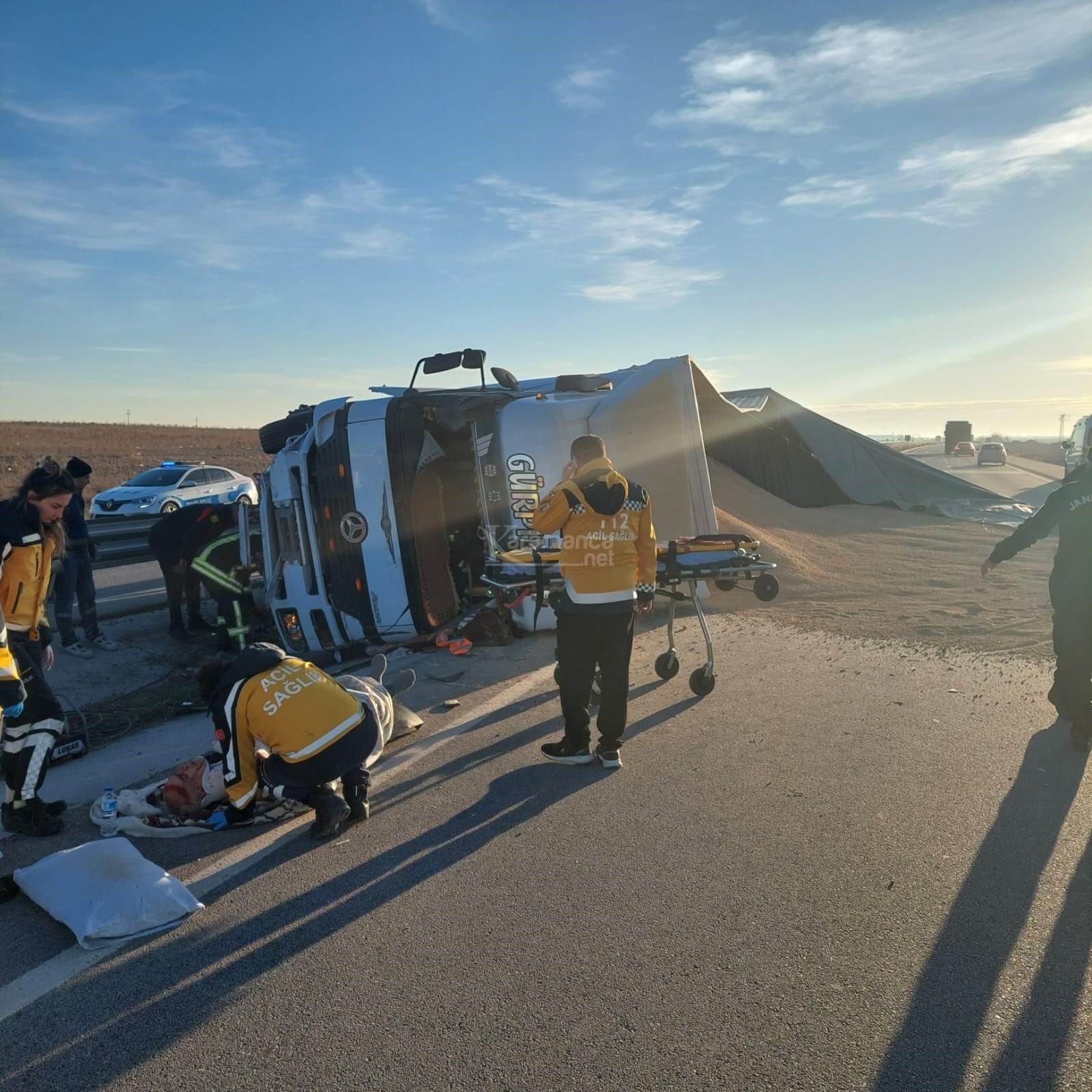 Kaza, Karapınar ilçesi Merdivenli mevkiinde meydana geldi. Edinilen bilgiye göre, E.G. (58) idaresindeki 20 AHY 747 plakalı Mercedes marka buğday yüklü tır, 06 DAB 923 plakalı dorsesinin lastiğinin patlaması sonucu kontrolden çıktı.