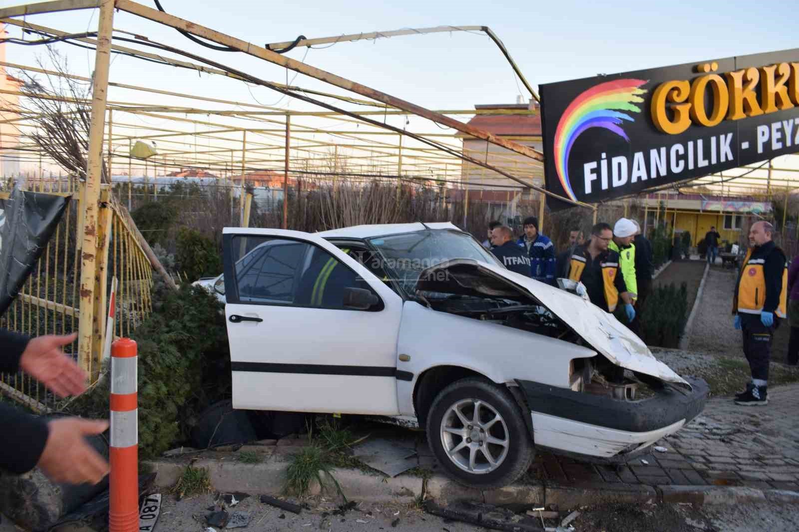 Karaman'da hafif ticari araçla otomobilin çarpıştığı kazada can pazarı yaşandı. Çarpışmanın şiddetiyle savrulan otomobil yol kenarındaki fidan satışı yapan iş yerine daldı.