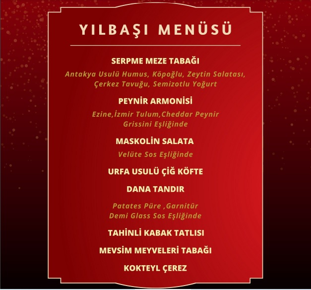Otelin damak zevkinizi şımartacak ve yılbaşı ruhunu yansıtan özel lezzetlerle dolu menüsü şöyle;