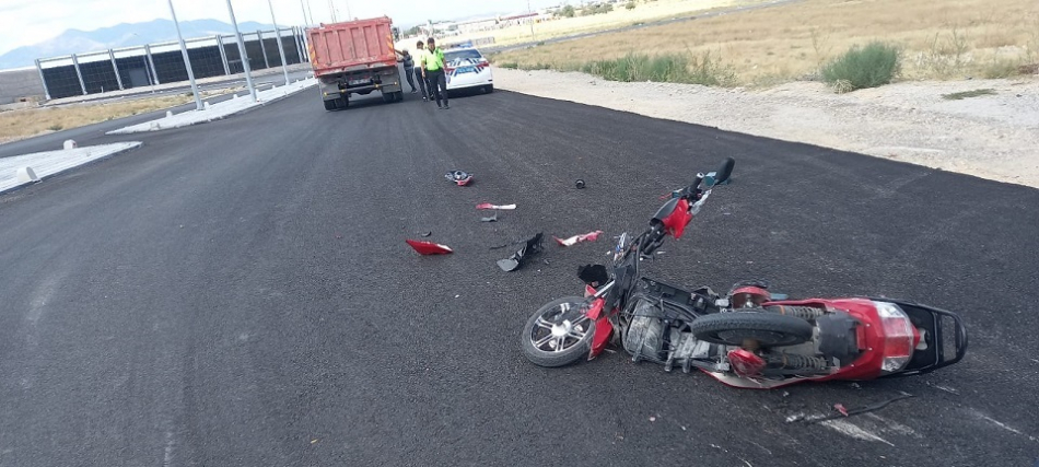 Karaman’da seyir halindeki kamyon motosikleti altına aldı. Son anda motosikletinden atlayan sürücü hafif şekilde yaralandı.