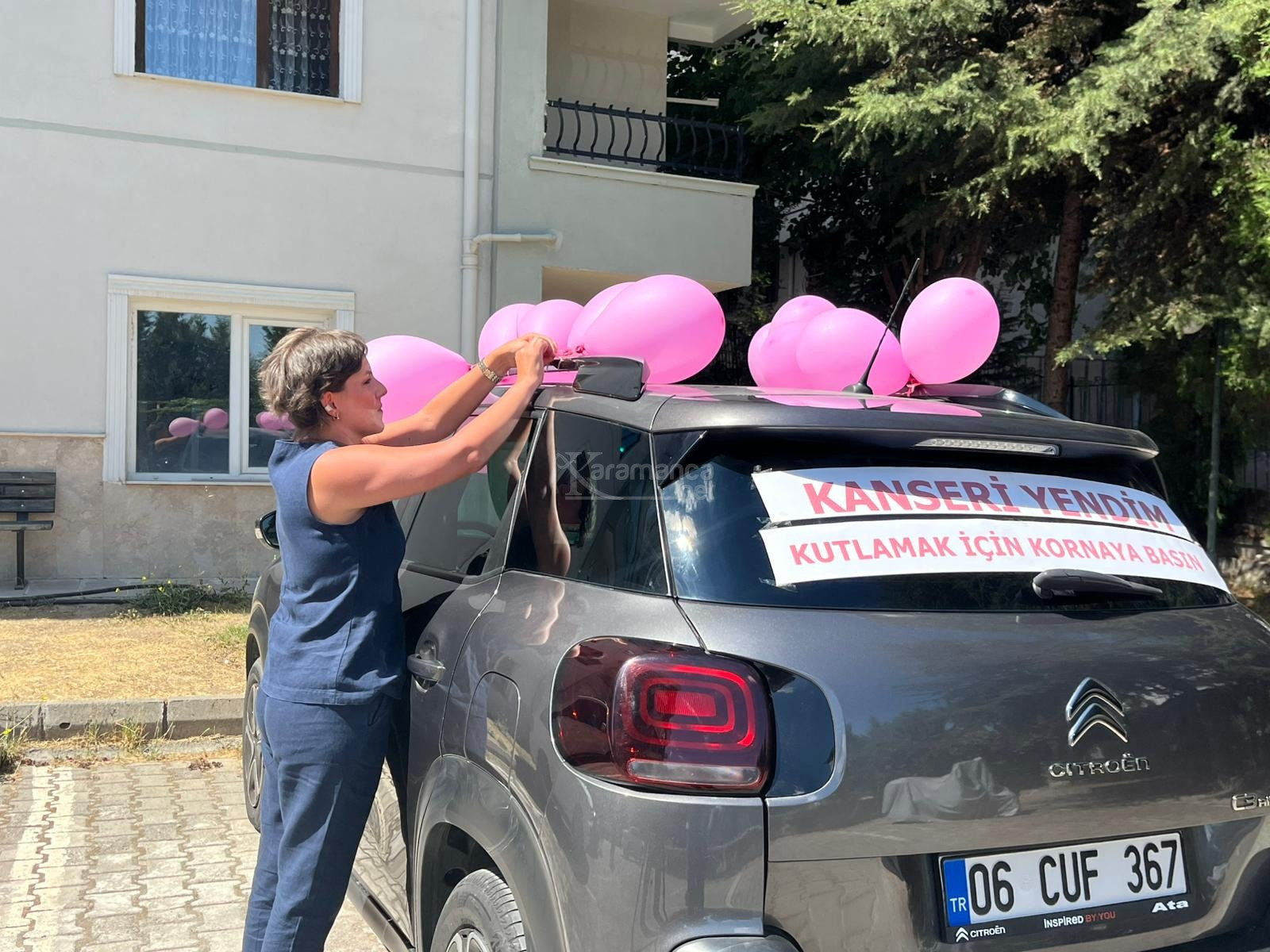 ANKARA'da hemşire Pelin Uzunoğlu (38), yaklaşık 15 ay süren tedaviyle meme kanserini yendi. 3 Eylül'de son ilacını alan ve tedavisi tamamlanan Uzunoğlu, aynı gün otomobilini süsleyip, şehir turu atarak kutlama yaptı.