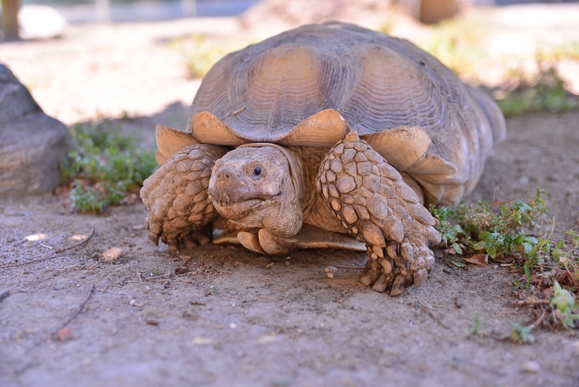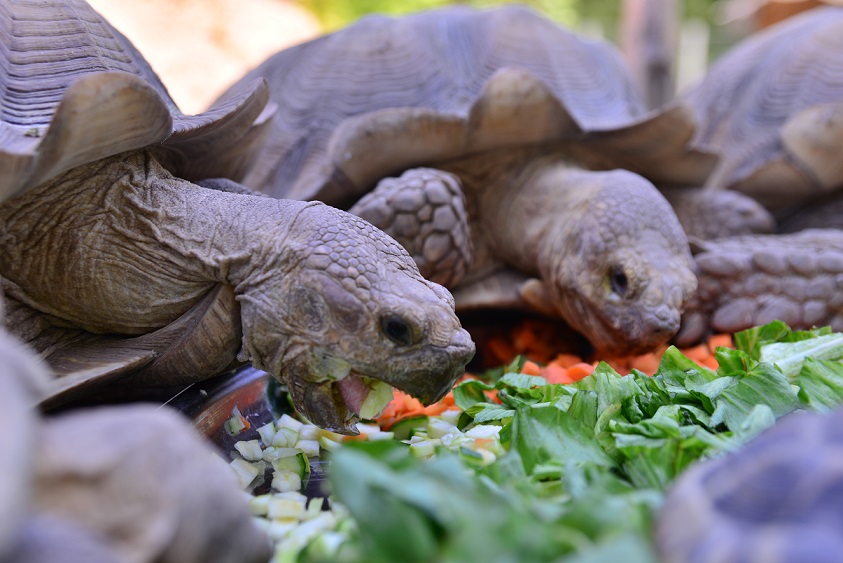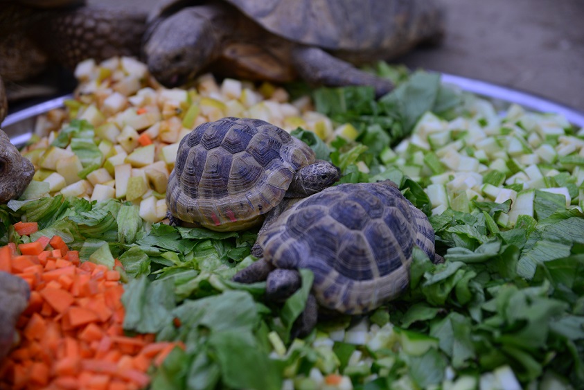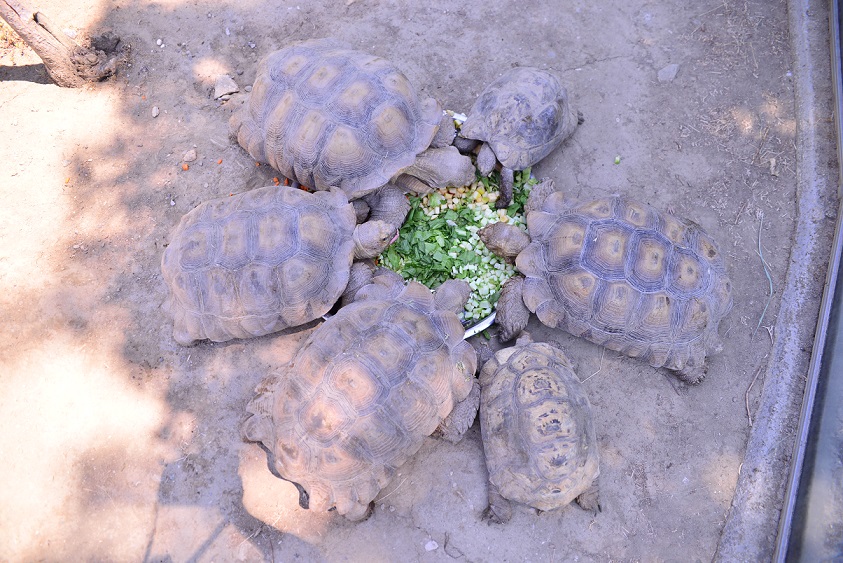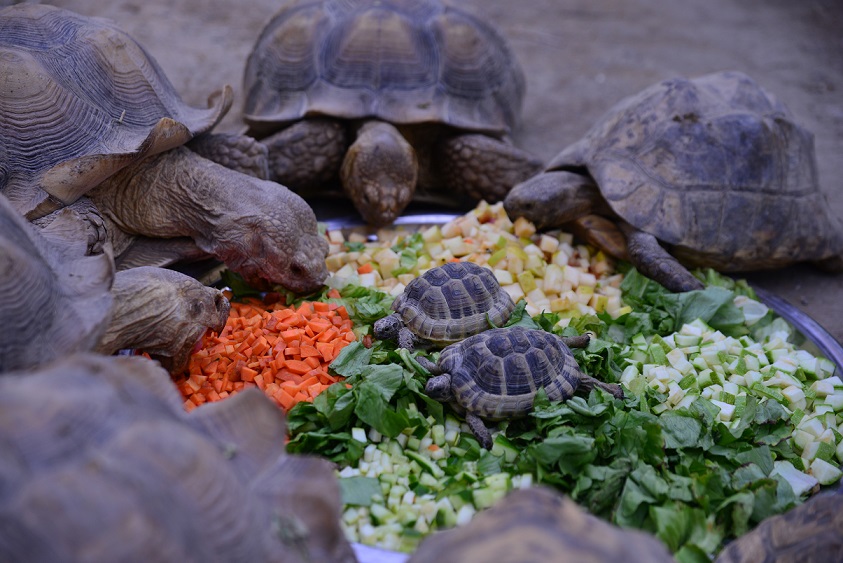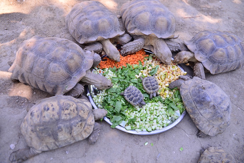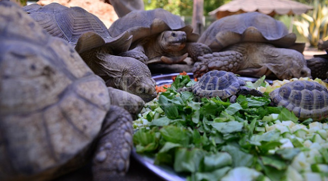 Hayvanat bahçesinde bulunan Afrika Evleri Barınağı'nda yaşamlarını sürdüren 8'i yetişkin, 7'si yavru 15 leopar kaplumbağa ile Afrika kaplumbağası, görevliler tarafından özenle bakılıyor. Kaplumbağalar, önlerine konulan tepsideki havuç, marul, elma, kabak, kavun ve karpuzları yiyerek, güne keyifle başlıyor. Tepsiye ulaşamayan yavru kaplumbağalar da bakıcıları tarafından içine konuldukları tepside serpme kahvaltılarını yapıyor.
