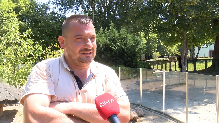 Hava sıcaklığının yüksek olması nedeniyle kaplumbağaları daha hafif gıdalarla beslediklerini belirten hayvan bakıcısı Ergün Kuva, "Şu an Afrika Evleri Barınağı'ndayız. Afrika kaplumbağası ve leopar kaplumbağalarının beslemesini yaptık. Malum havalar sıcak.