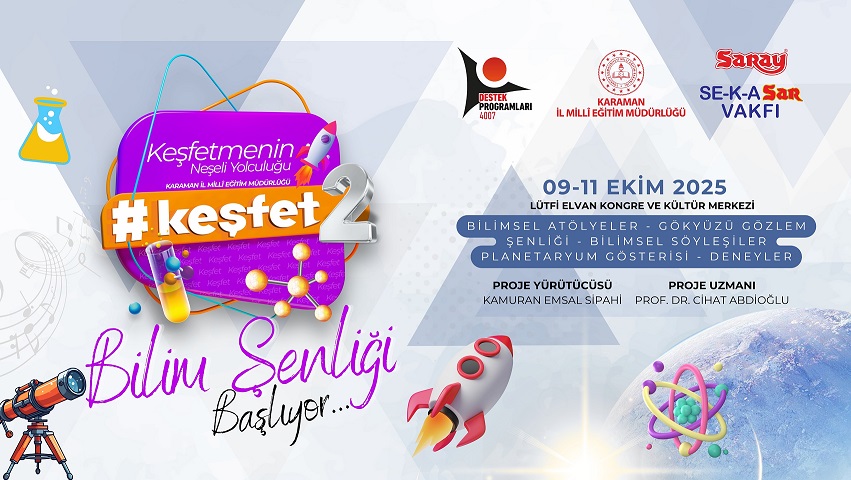Karaman İl Milli Eğitim Müdürlüğü ile Saray SE-K-A Sar Vakfı iş birliğinde düzenlenen Bilim Şenliği, 9-11 Ekim 2025 tarihleri arasında Lütfi Elvan Kongre ve Kültür Merkezi’nde gerçekleştirilecek.