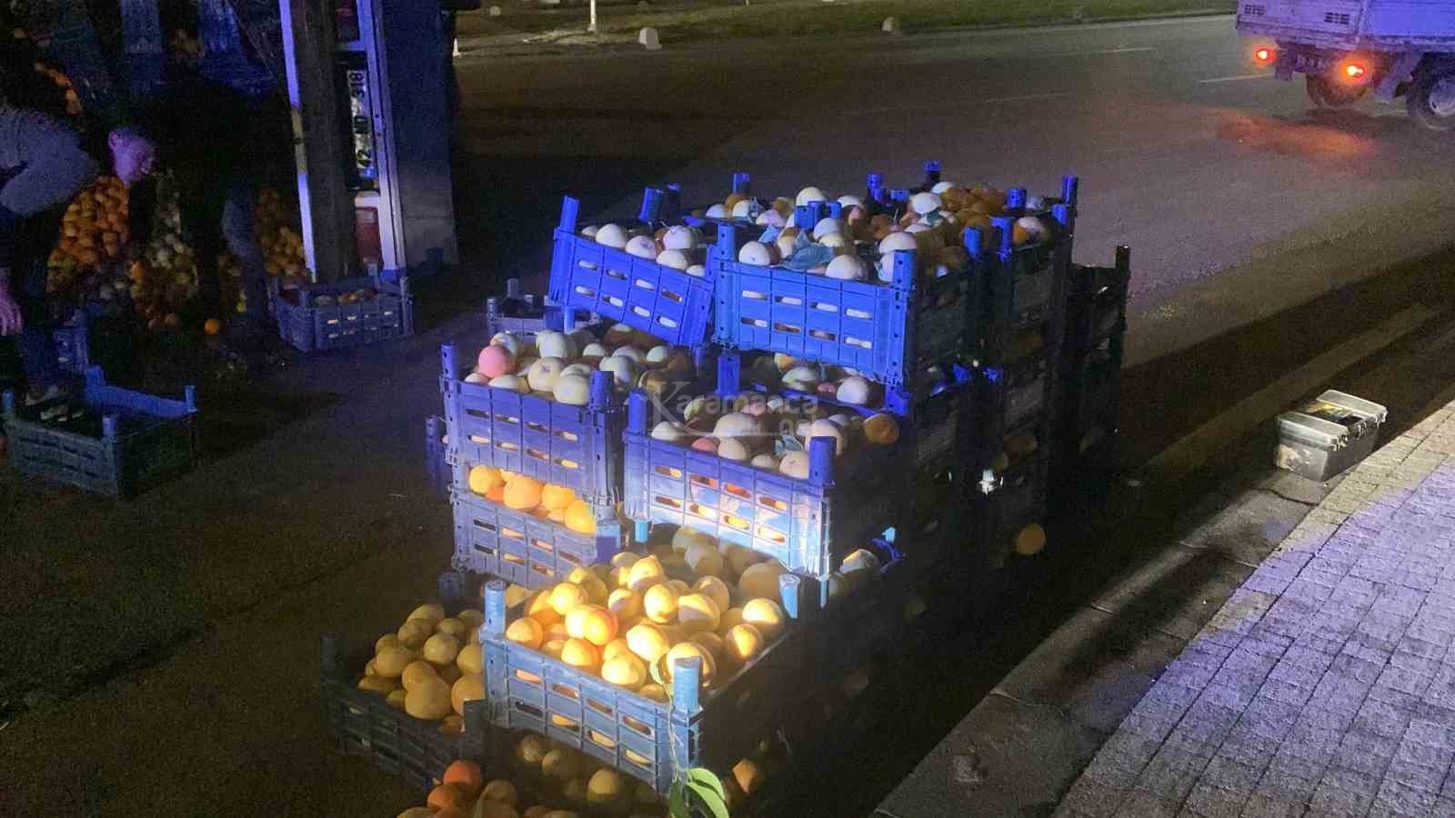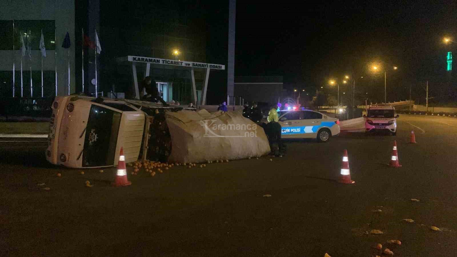 Karaman'da narenciye yüklü kamyonet kavşakta devrildi. Sürücünün ölümden döndüğü kazada kamyonetteki narenciye ürünlerinin bir kısmı yola saçıldı.
