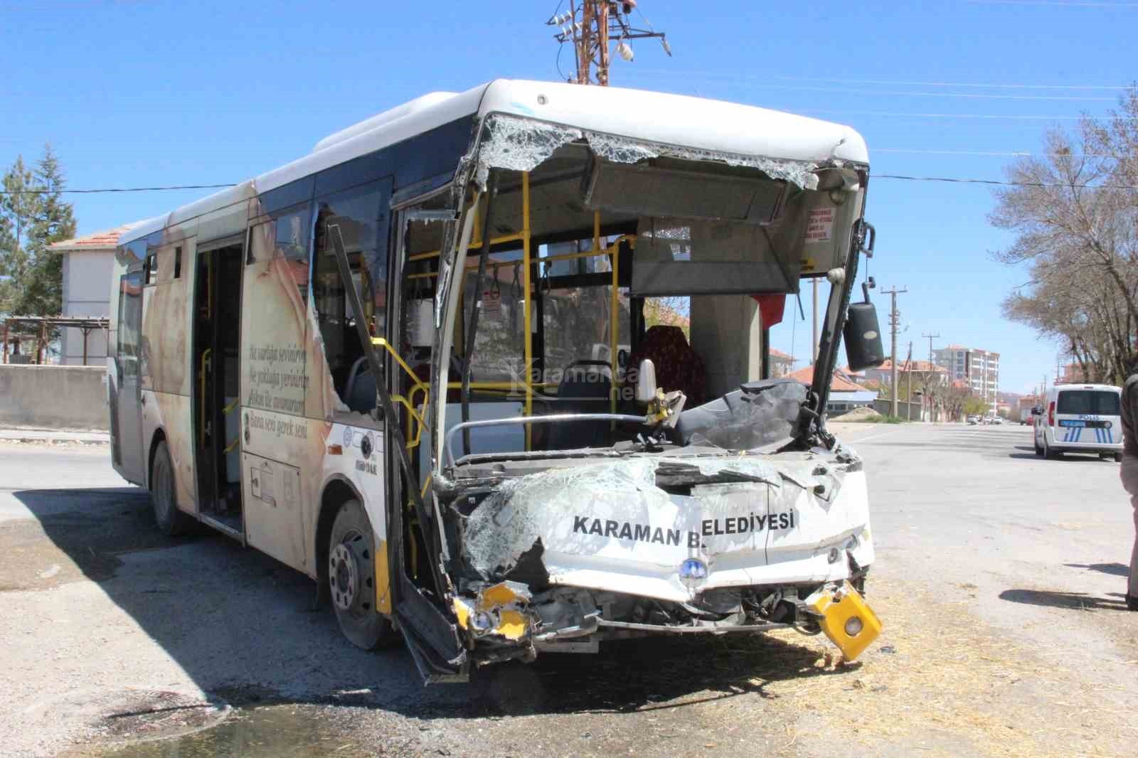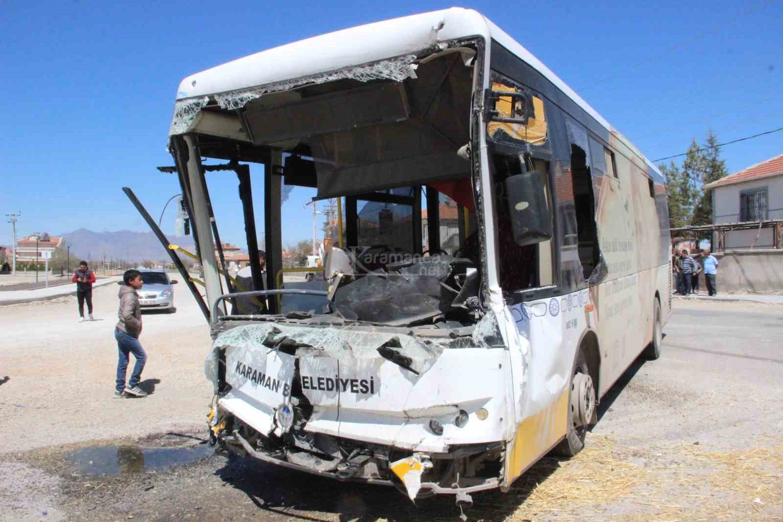 Edinilen bilgiye göre, sürücüsünün ismi alınamayan 70 BB 519 plakalı halk otobüsü ile M.Ç. idaresindeki 42 J 8413 plakalı saman balyası yüklü kamyon kontrolsüz kavşakta çarpıştı.