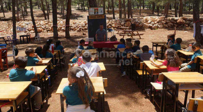 Karaman'ın Ermenek ilçesinde öğrenciler okulların kapanmasına 1 hafta kala resim, müzik ve beden eğitimi derslerini açık alanda yapıyor.
