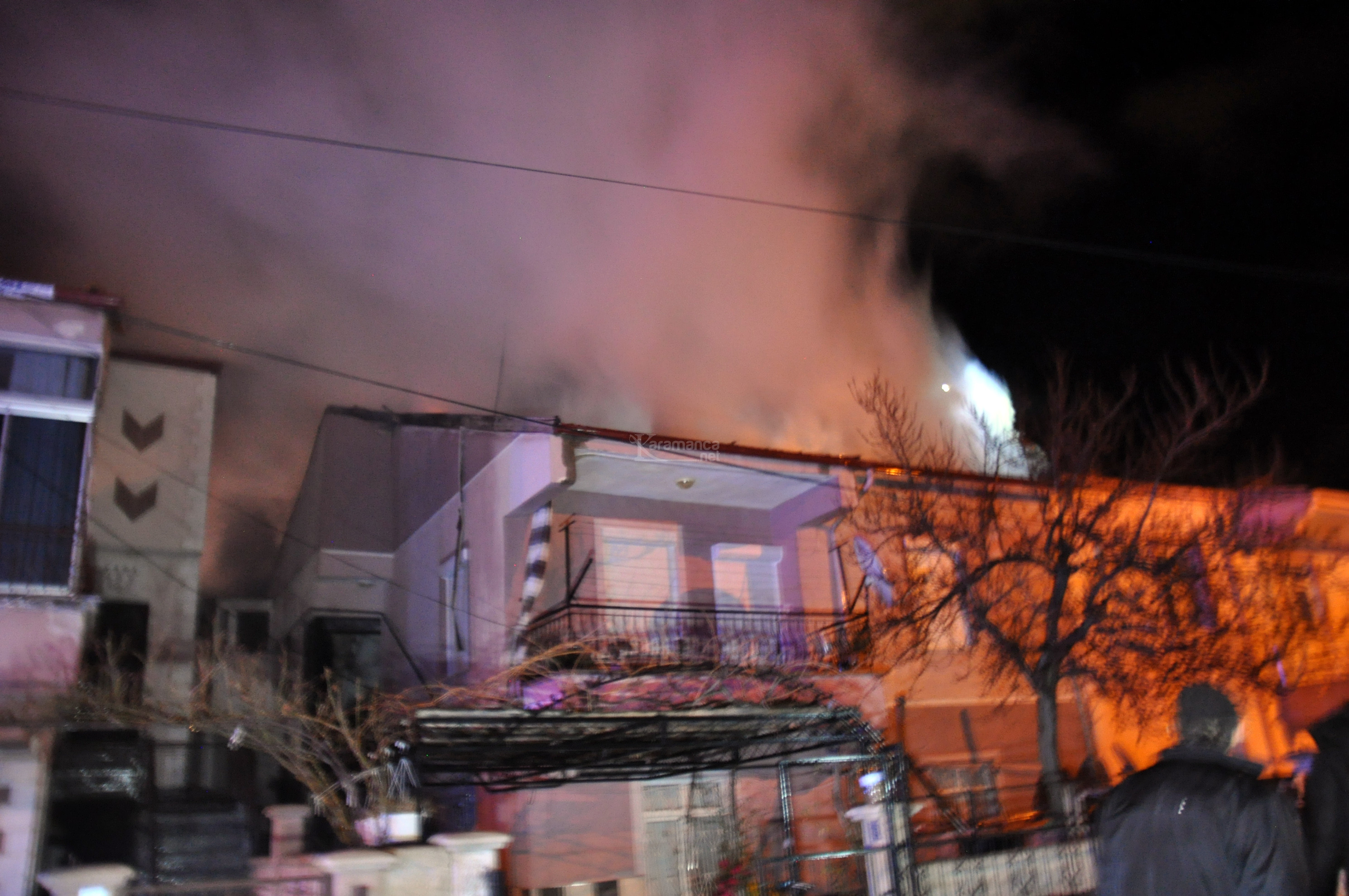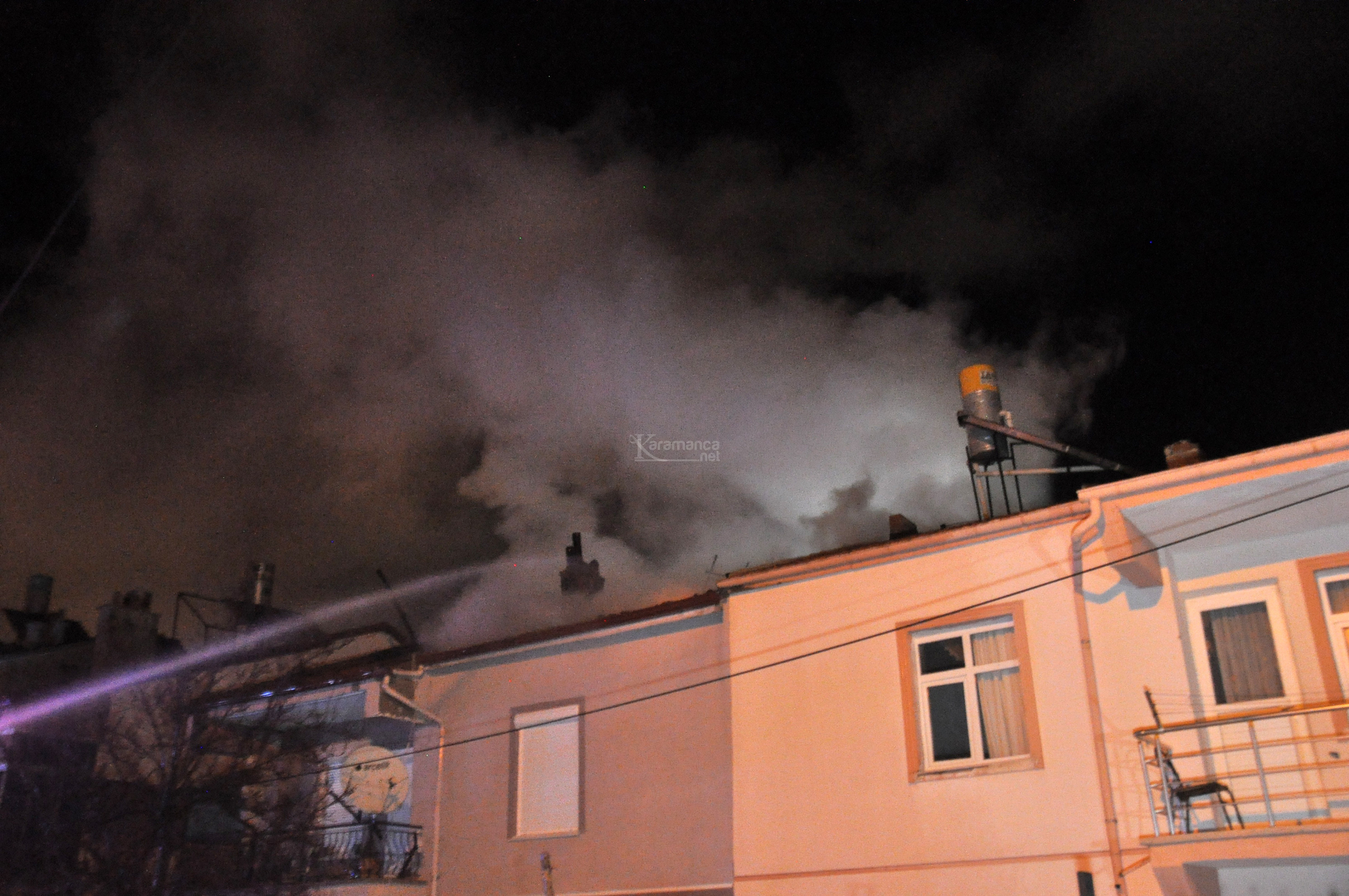 KARAMAN'da iki katlı evin çatısında çıkan yangında rüzgarın da etkisiyle alevler yan binanın çatısına sıçradı. Yangın itfaiye ekiplerinin müdahalesiyle söndürülürken, dumandan etkilenen 3 kişi hastaneye kaldırıldı.