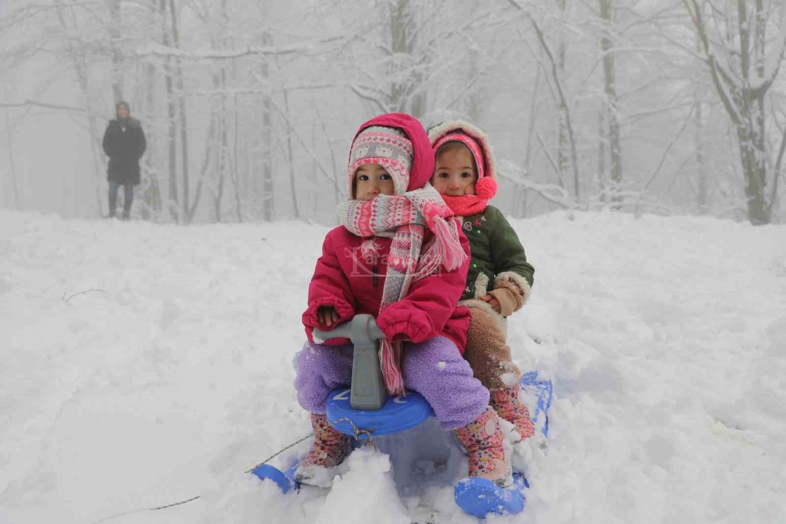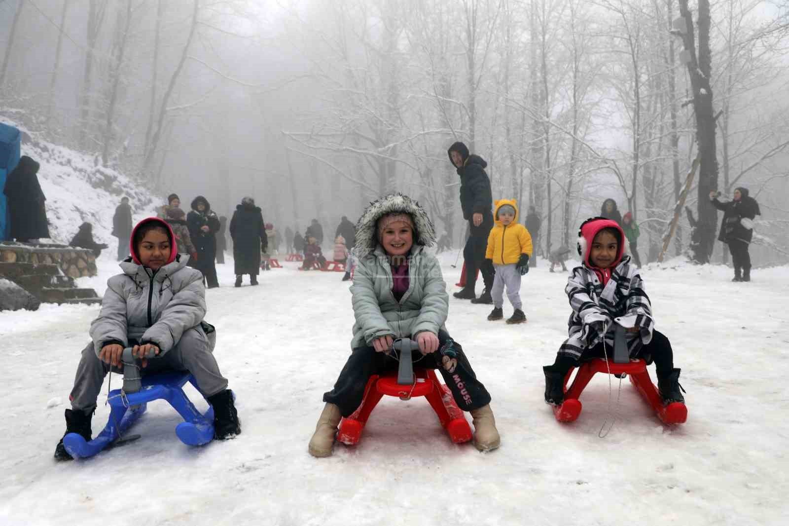 Yüksek kesimlerde etkisini gösteren kar yağışı sonrasında beyaza bürünen Sakarya'nın Akyazı ilçesinin yüksek kesimleri, Uludağ ve Kartepe'deki kayak merkezlerini aratmayan görüntülere sahne oldu. Kızağını alanın koştuğu bölgede aileler karın tadını çıkardı.