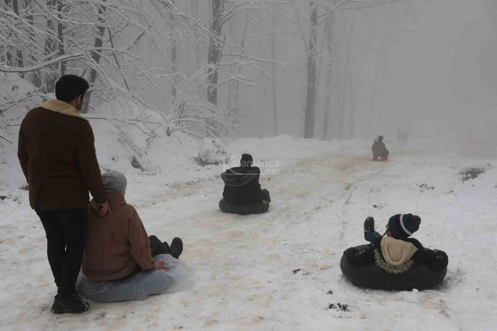 Meteoroloji Genel Müdürlüğü'nün uyarıları sonrasında Sakarya'nın yüksek kesimlerinde kar yağışı etkisini göstermeye devam ediyor. Bu çerçevede, Akyazı Belediyesi tarafından Güzlek Mahallesi Aktepe'de kızak merkezi haline getirilen bölgede kar ve doğanın tadını çıkartmak için akın etti. Ara yıl tatilinin de gelmesiyle bölgede oluşan yoğunluk Uludağ ve Kartepe kayak merkezlerindeki görüntüleri aratmazken, 7'den 70'e herkes gönlünce eğlendi.
