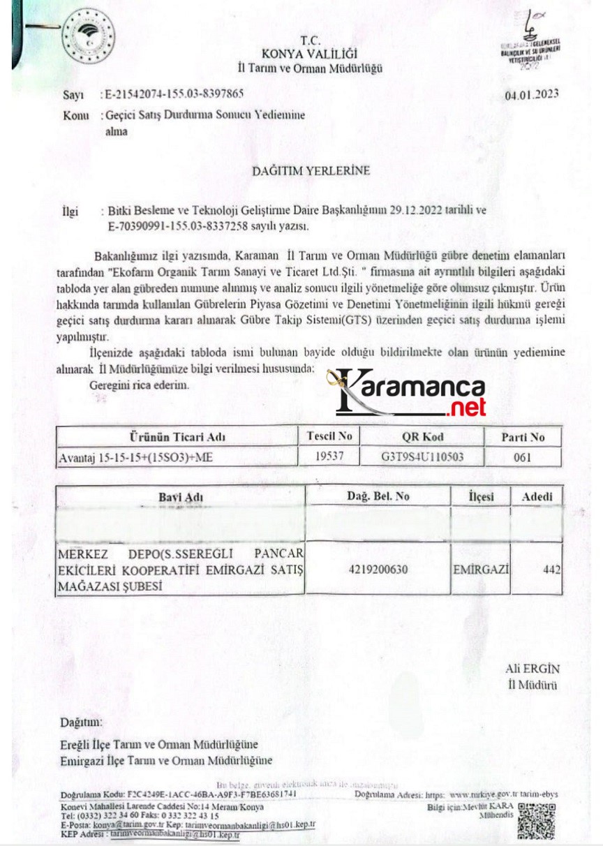 Bu vahim tablo üzerine 29 Aralık 2022’de Tarım ve Orman Bakanlığı Bitkisel Üretim Genel Müdürlüğü ürüne geçici satış durdurma kararı vermiş. Tabi süreç bununla sınırlı kalmıyor. 04 Ocak 2023’te Konya İl Tarım ve Orman Müdürlüğü, Ereğli PANKO Emirgazi Satış Mağazası’nda yaptığı denetimde aynı üründen 442 torba bulunduğunu tespit ediyor ve bu gübrelerin satışı durdurularak yediemine alınıyor. Fakat aradan geçen zamanda tablo hiç değişmiyor. Yapılan her yeni analizde sahtecilik bir kez daha doğrulanıyor.