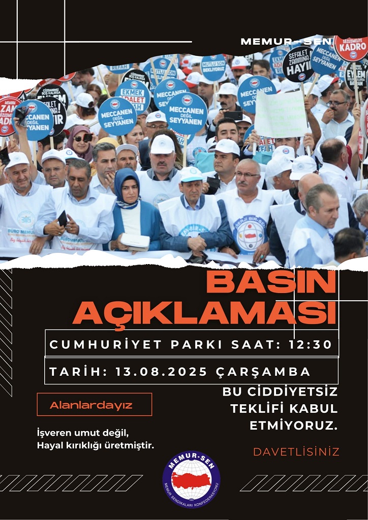 Yarın 81 ilde olduğu gibi, Karaman’da da 13.08.2025 Çarşamba günü Cumhuriyet Parkında, Saat:12.30 ‘da basın açıklaması ve eylem gerçekleştirilecektir. Tüm basın mensupları, kamu emekçileri ve emeklilerimiz davetlidir.