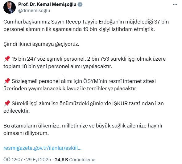 Sağlık Bakanı Kemal Memişoğlu sosyal medya hesabından paylaşım yaparak Sağlık Bakanlığına sözleşmeli ve sürekli işçi alımı yapılacağını duyurdu. Bakan Memişoğlu, "Cumhurbaşkanımız Sayın Recep Tayyip Erdoğan'ın müjdelediği 37 bin personel alımının ilk aşamasında 19 bin kişiyi istihdam etmiştik. Şimdi ikinci aşamaya geçiyoruz.