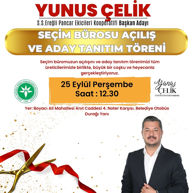 Ereğli’de üreticiye yönelik yeni bir dönemin kapısını aralayacak önemli bir buluşma gerçekleşiyor. Ereğli Pancar Ekicileri Kooperatifi Başkan Adayı Yunus Çelik ve ekip arkadaşlarının seçim bürosu açılışı ile aday tanıtım töreni, 25 Eylül Perşembe günü saat 12.30’da büyük bir coşku ve heyecanla yapılacak.