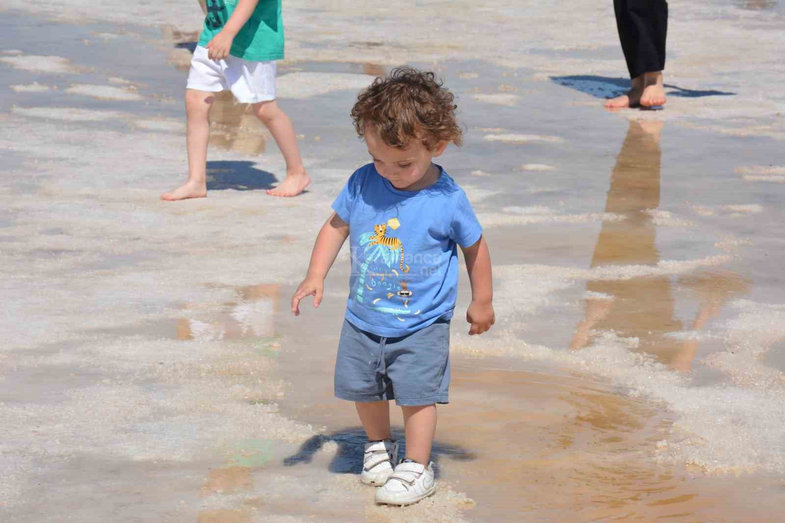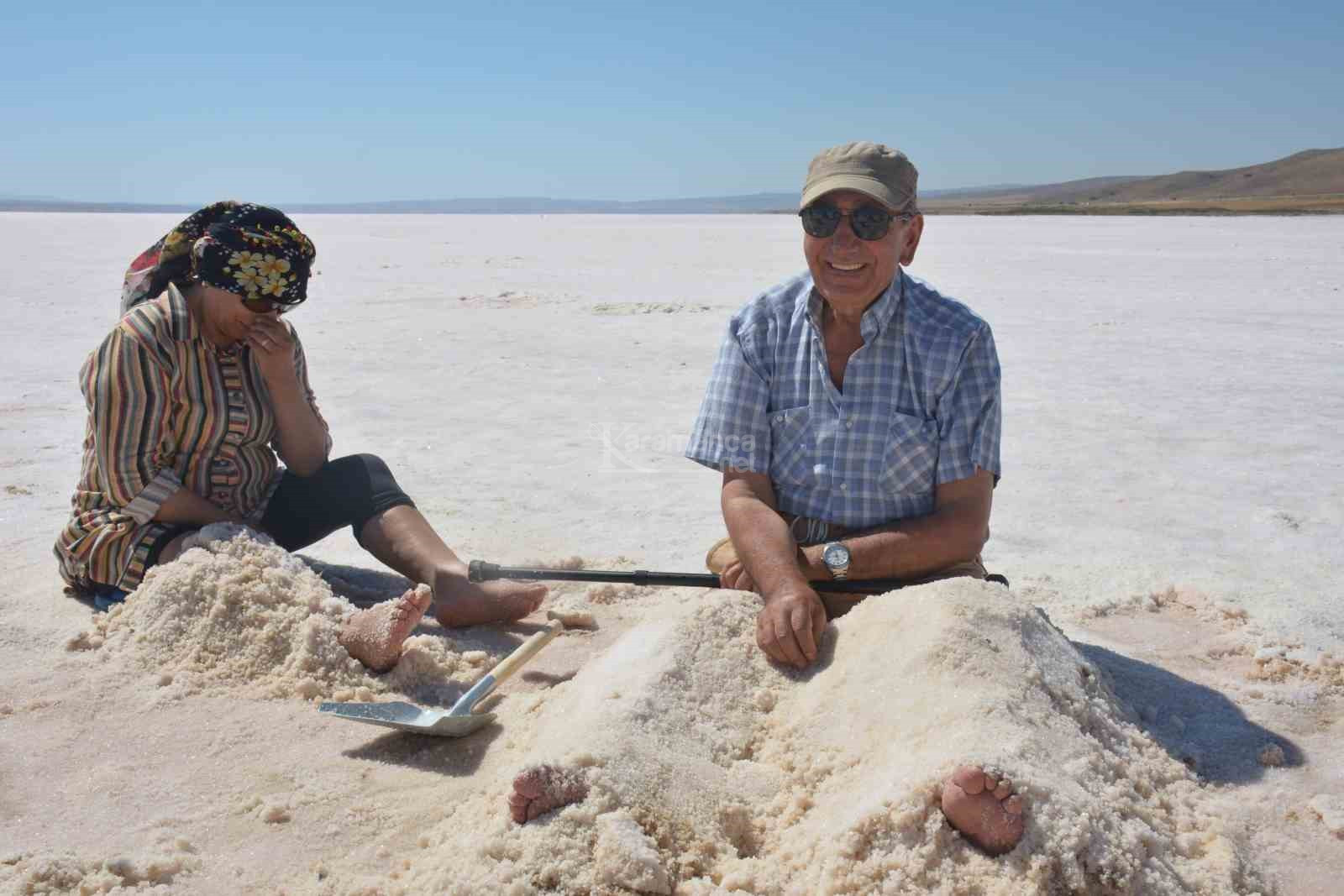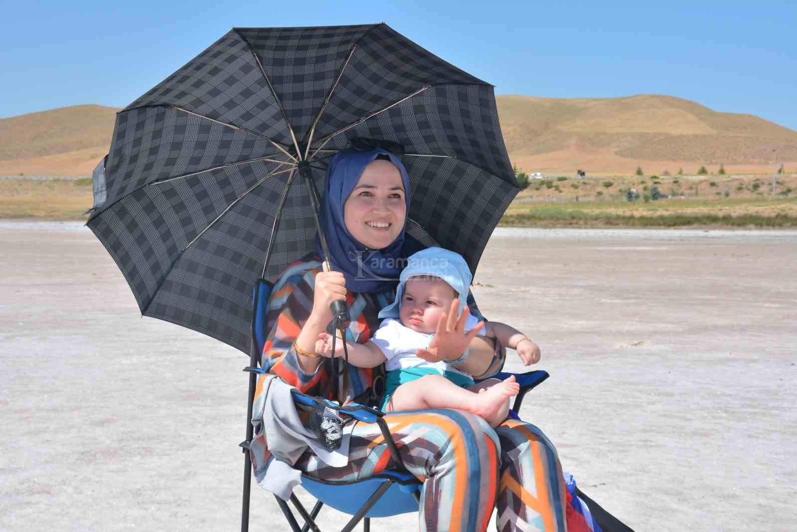 Yeni doğan bebeği ile Tuz Gölü'ne gelen Merve Yüksel ise güneşten şemsiyesiyle korunarak, ayaklarını saatlerce tuzlu kumda beklettiğini ifade etti. Yüksel, daha önce de buraya geldiklerini belirterek, "Ayaklarımız ile birlikte tuzda kendimizi komple gömdüğümüz de oldu. Ayaklarımıza tedavi için de geliyoruz bir yandan da. Bebeğimiz de yeni oldu. Ona da gösterelim dedik. Tuz şifa. Kendi tuzumuzu da kullanıyoruz ama ayaklarını soksunlar. Romatizması ve ayaklarında özellikle mantar olan varsa soksun" dedi.