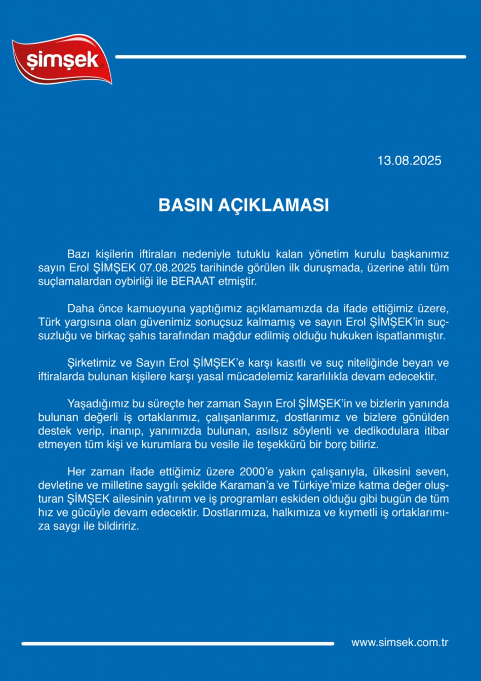 Şimşek Bisküvi Yönetim Kurulu Başkanı Erol Şimşek, hakkında ortaya atılan iddialarla ilgili yazılı basın açıklaması yaptı. Şirket yaptığı paylaşımda, bazı kişilerin iftiraları nedeniyle tutuklu kalan Erol Şimşek’in, 07 Ağustos 2025 tarihinde görülen ilk duruşmada tüm suçlamalardan oybirliği ile beraat ettiğini belirtti.