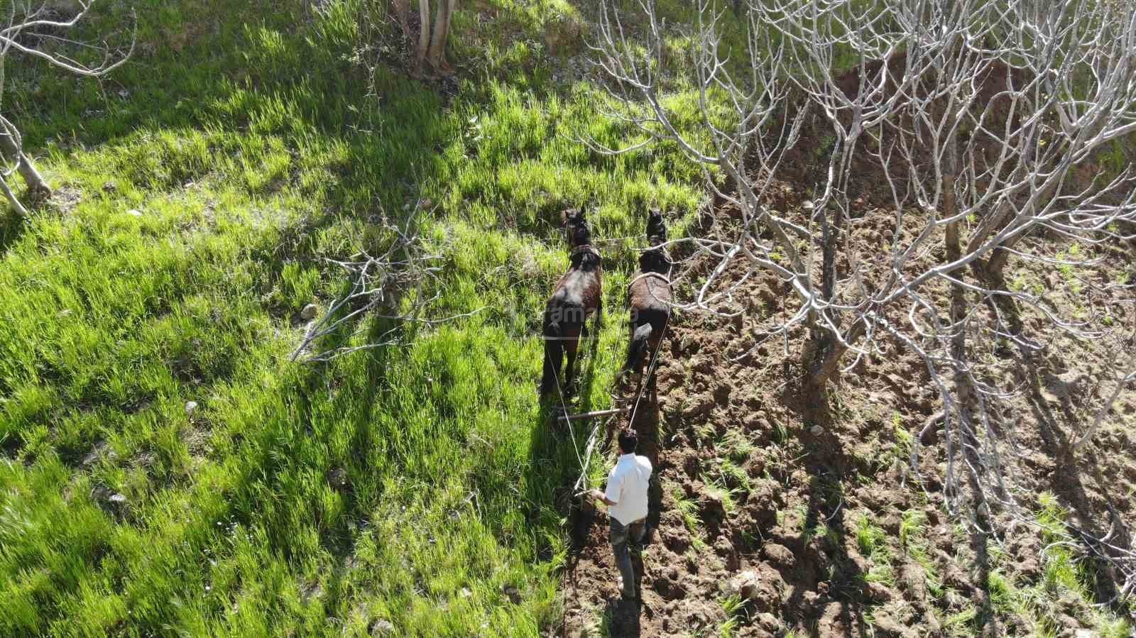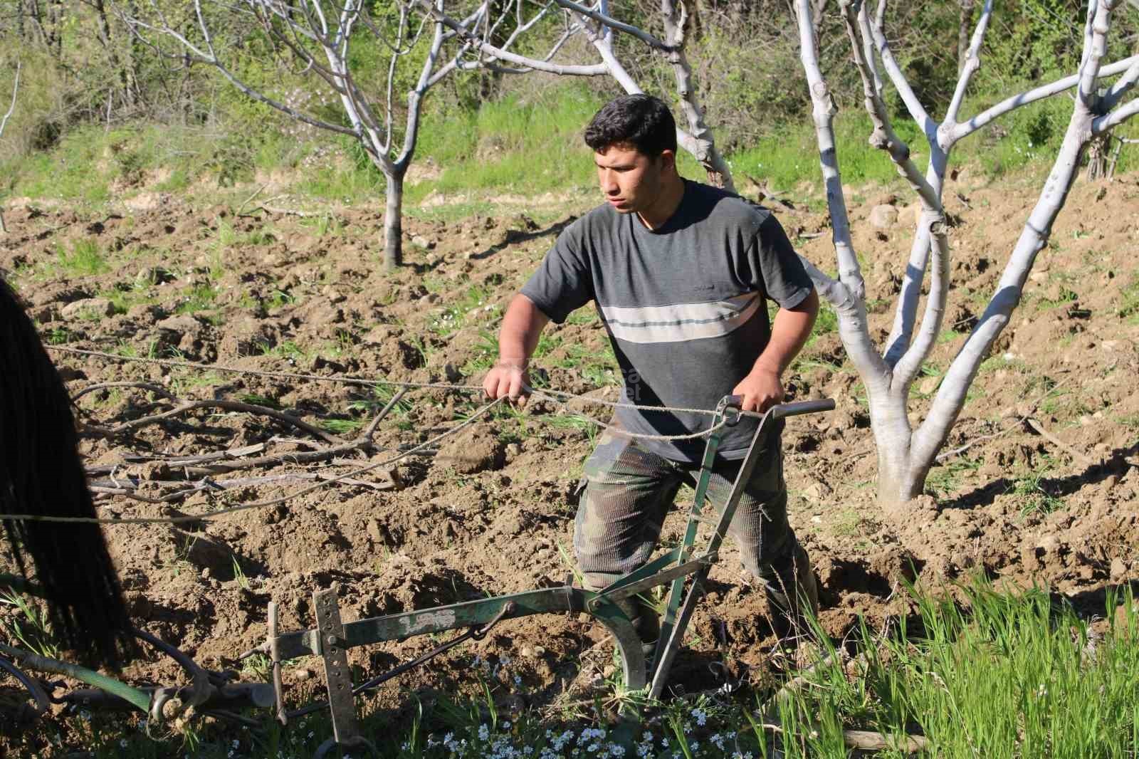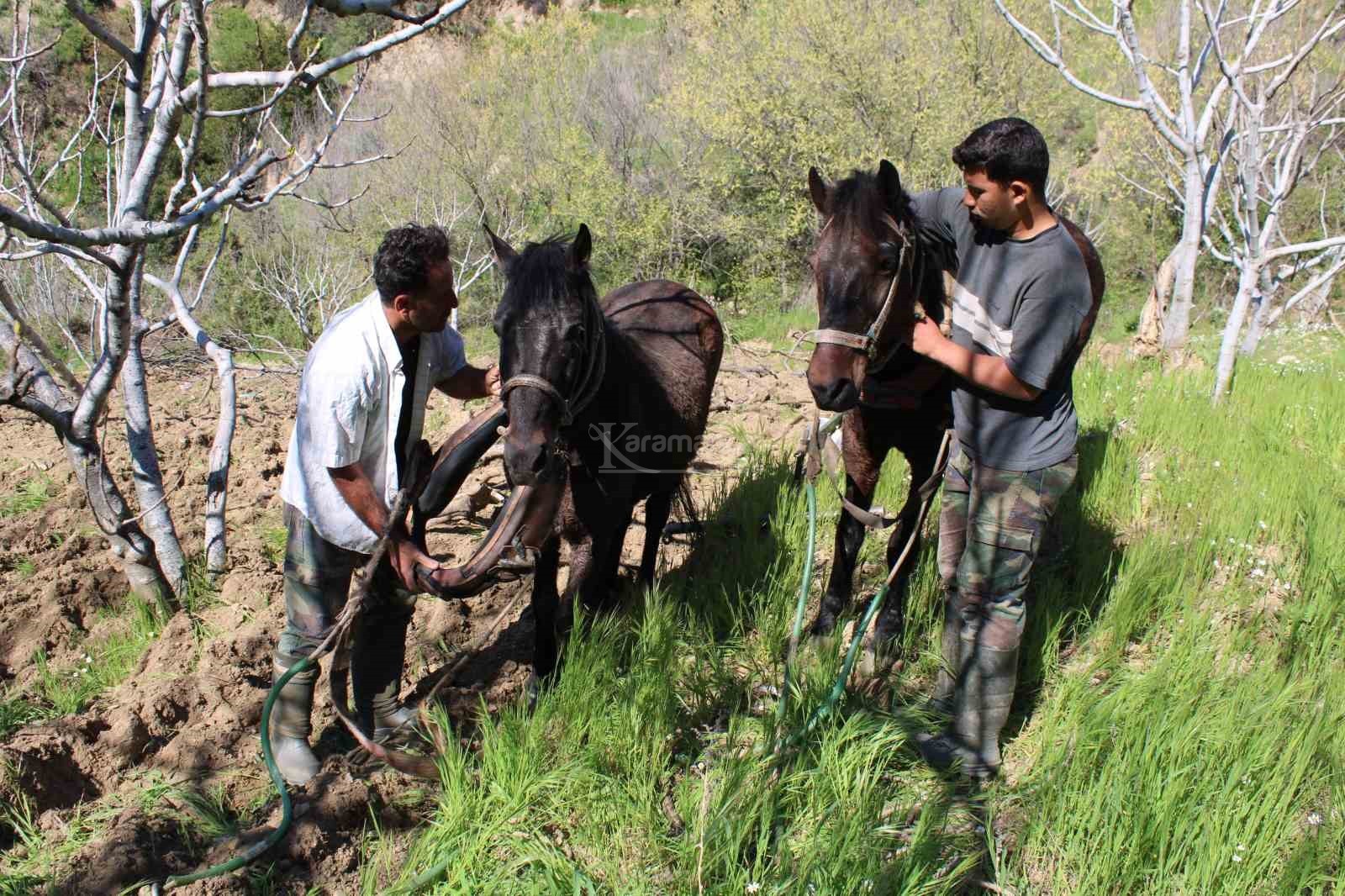 Traktörün giremediği dağlık arazilerde atlara koştuğu karasaban ile çift sürerek üretim yapan İsmail Açıkgöz, ekonomik imkansızlıklardan değil arazinin engebeli yapısından dolayı bahçelerini atlarla sürerek işlediklerini belirtti. Ramazan ayında oruçlu olmalarına rağmen toprağın tavının kaçmaması için çift sürmek zorunda olduklarını ve yaşanan kuraklık sebebiyle zamanla yarıştıklarını belirten Açıkgöz, "Çocukluğumdan beri çiftçilikle uğraşıyorum. Şartlar zor, arazi engebeli traktör giremediği için hayvanlarla işimizi görüyoruz.