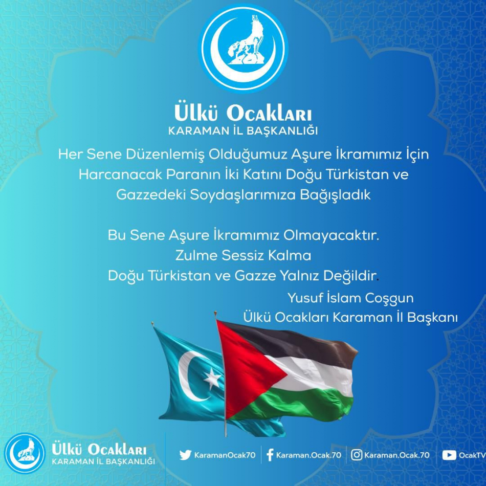 Konuya ilişkin yapılan açıklamada, "Her sene düzenlemiş olduğumuz aşure ikramımız için harcanacak paranın iki katını Doğu Türkistan ve Gazze'deki soydaşlarımıza bağışladık. Bu sene aşure ikramımız olmayacaktır. Zulme sessiz kalma, Doğu Türkistan ve Gazze yalnız değildir" denildi.